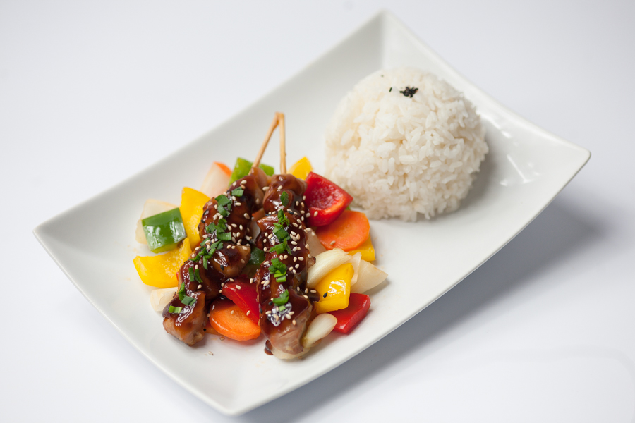 2 brochettes de poulet nappées de sauce soja au miel